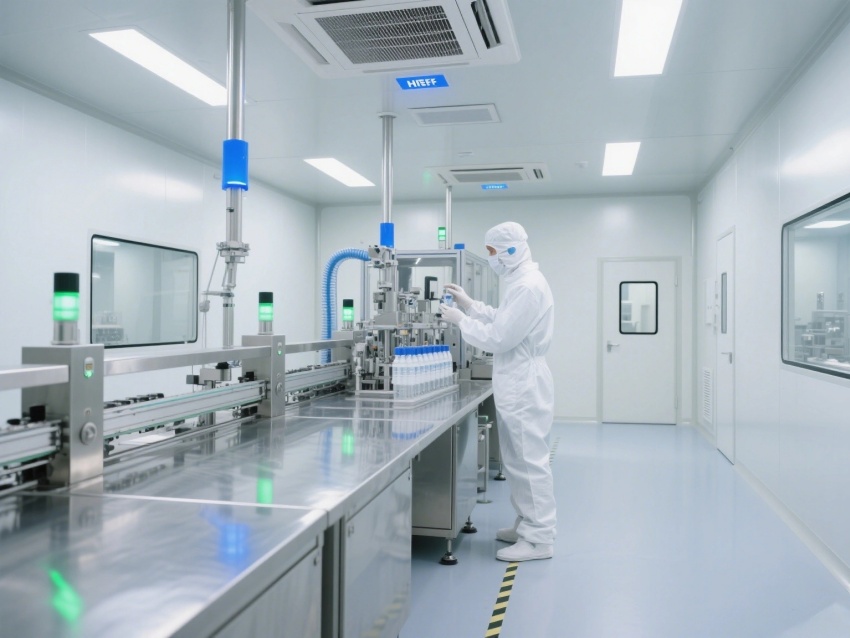 核心區(qū)域可見全封閉式潔凈廠房,墻面與地面采用無縫一體化設計,避免積塵殘留。多組高效空氣過濾器整齊排列于頂部,通過層流送風系統(tǒng)維持Class8級潔凈標準。?