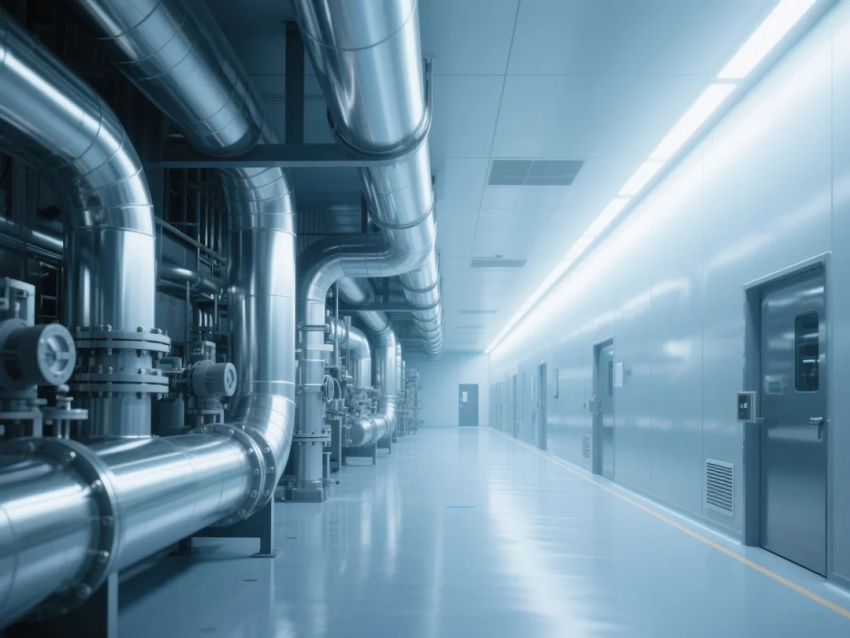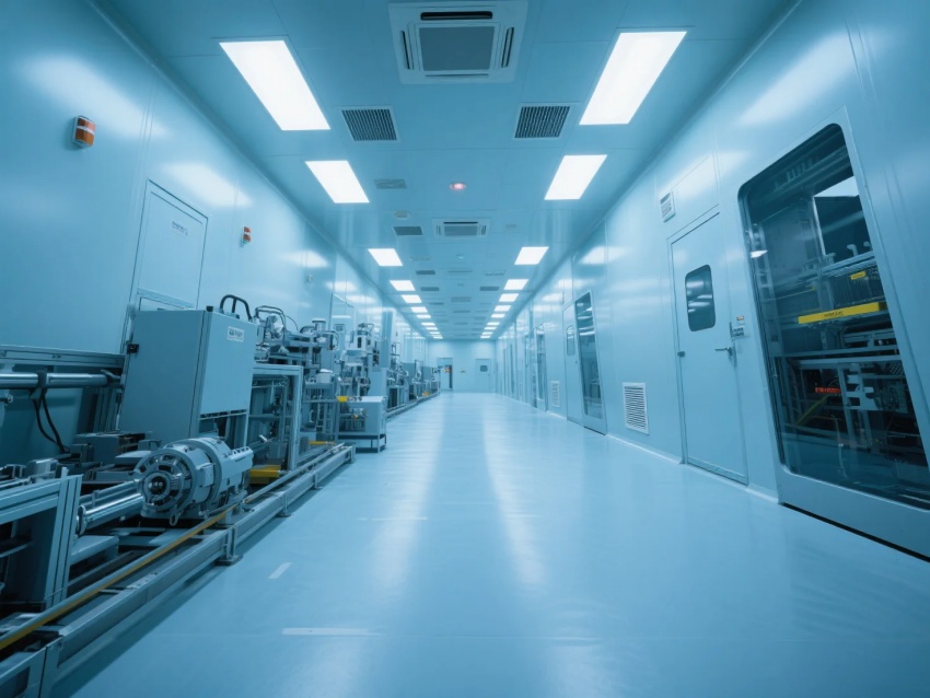 本方案嚴(yán)格遵循ISO6級(jí)(千級(jí))潔凈標(biāo)準(zhǔn),采用模塊化潔凈室結(jié)構(gòu),以灰白色調(diào)為主,搭配防靜電高架地板與金屬壁板,打造高精度半導(dǎo)體生產(chǎn)環(huán)境。