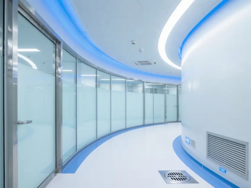 車間內設有多個玻璃門和窗戶,既保證了空間的通透感,又便于觀察內部情況。天花板上安裝了多盞方形的照明燈,提供充足的光線,同時還有通風設備,確??諝饬魍?。