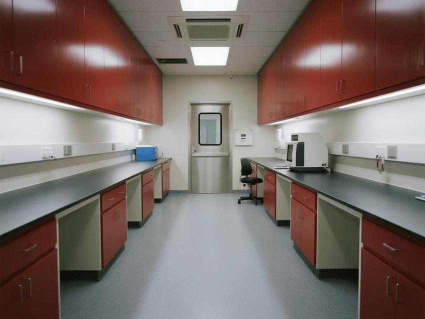 本實驗室嚴格遵循BSL-3級生物安全標準,通過深紅彩鋼板與淺灰環氧地坪的強烈視覺對比,構建安全高效的病原體研究空間。