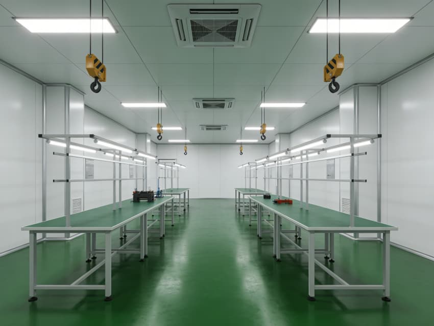 墻面采用白色食品級(jí)潔凈抗菌涂層施工,推行無(wú)縫拼接與高精度找直工藝,陰陽(yáng)角采用R50圓弧倒角處理,杜絕積塵死角,涂層附著力達(dá)2.5MPa,硬度≥2H,可耐受高頻次潔凈消殺與工業(yè)粉塵防護(hù)。各功能區(qū)域針對(duì)性實(shí)施專(zhuān)項(xiàng)工藝:核心加工區(qū)地面增設(shè)多層阻尼減震墊層,采用浮筑地面施工技術(shù),有效隔絕振動(dòng)干擾;檢測(cè)區(qū)墻面做保溫隔熱一體化處理,預(yù)留精密儀器專(zhuān)用管線預(yù)埋孔,確保恒溫恒濕環(huán)境穩(wěn)定;裝配區(qū)采用防靜電接地網(wǎng)格預(yù)埋工藝,保障零件裝配過(guò)程靜電安全。