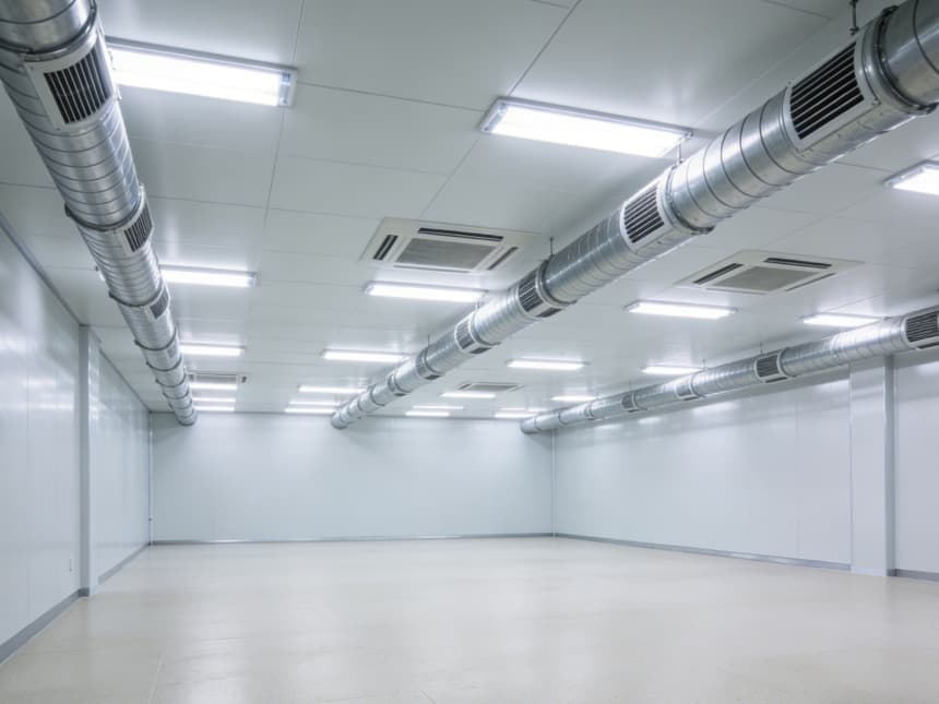 本次呈現的半導體器件生產廠房整體風格簡約專業,兼具工業嚴謹性與潔凈生產適配性。廠房外立面采用淺灰色工業涂層搭配大面積隔音保溫玻璃,既保障建筑密封性,又滿足車間自然采光需求,入口區域預留潔凈風淋室安裝位,從源頭把控潔凈度。