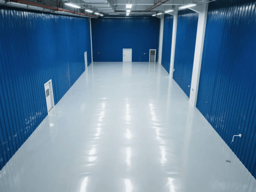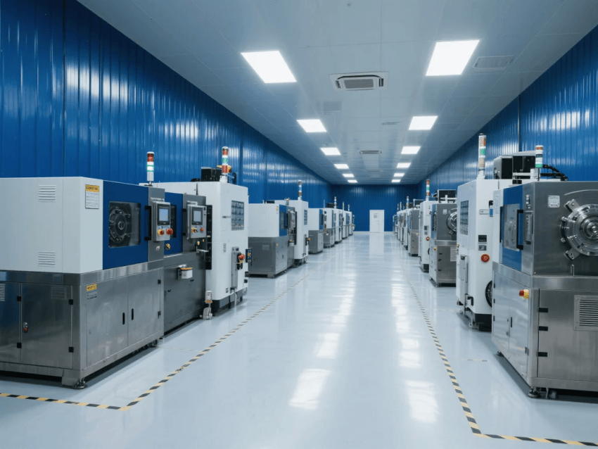 本方案以工業(yè)科技風(fēng)為設(shè)計導(dǎo)向,打造符合ISO14644-1Class7標準的智能化注塑生產(chǎn)環(huán)境。空間主體采用深藍色彩鋼板墻體與淺灰防靜電環(huán)氧自流平地坪,形成冷峻而富有科技感的視覺層次。地面系統(tǒng)電阻值穩(wěn)定控制在10^6~10^9Ω,兼具防靜電與耐磨特性,滿足精密注塑工藝需求。