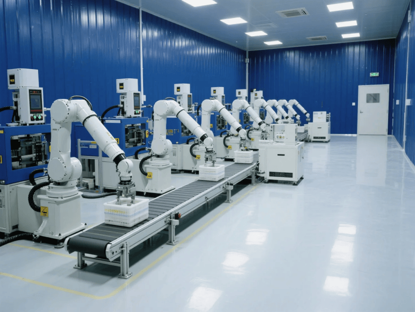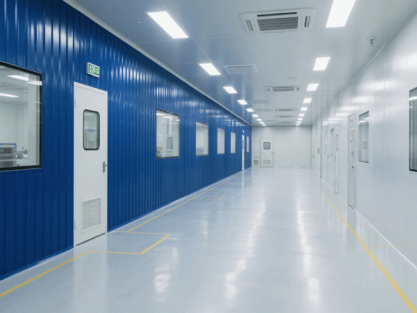 車間采用模塊化潔凈結(jié)構(gòu),50mm厚深藍抗菌彩鋼板墻體搭配圓弧收邊工藝,確保無塵死角。自動化注塑機與機械臂工作站呈流水線布局,設(shè)備區(qū)采用淺灰不銹鋼圍擋,與深藍墻體形成鮮明對比。吊頂系統(tǒng)配置FFU高效過濾單元,維持≥25次/h換氣次數(shù),氣流組織采用頂送側(cè)回模式,確保溫濕度與潔凈度穩(wěn)定。