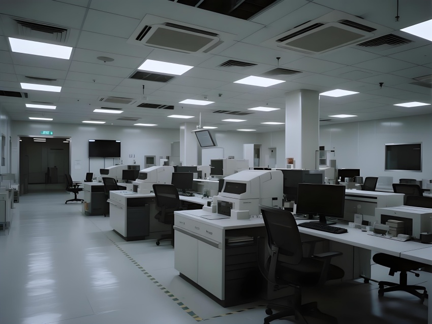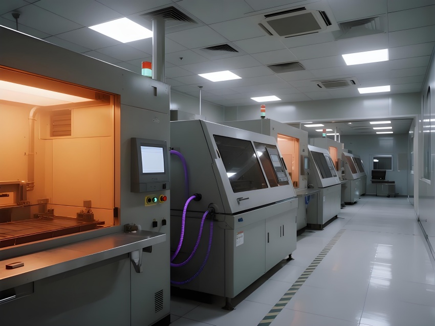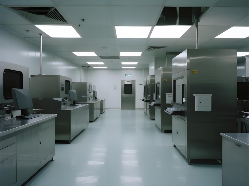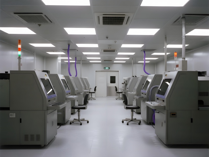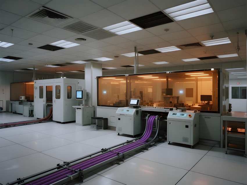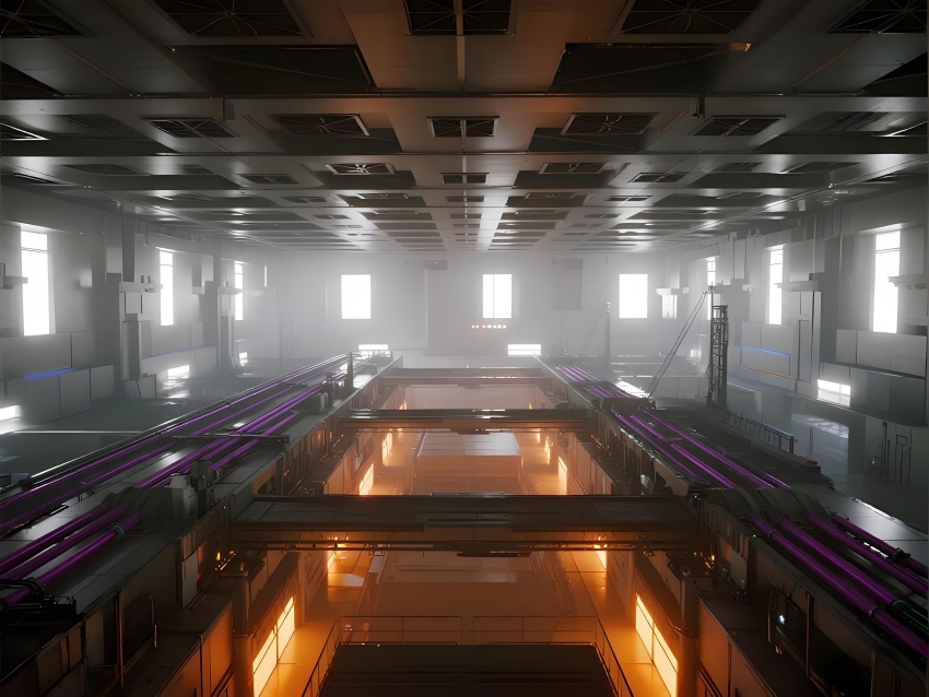 本芯片廠采用"硅基未來主義"設(shè)計(jì)風(fēng)格,將納米級制造的精密感轉(zhuǎn)化為宏大的工業(yè)美學(xué)。空間以鈦銀與深空灰為主色調(diào),光刻區(qū)的琥珀色防霧照明與蝕刻區(qū)的冷紫工藝氣體管道形成科技光譜。高架地板下的藍(lán)色氣流指示燈模擬集成電路紋路,天花板的矩陣式FFU單元如晶圓陣列般規(guī)整。透明設(shè)備艙內(nèi)機(jī)械臂的精準(zhǔn)運(yùn)動軌跡,與墻面懸浮的晶圓生產(chǎn)數(shù)據(jù)流構(gòu)成動態(tài)敘事。防靜電涂層的金屬質(zhì)感表面反射出潔凈室的無限縱深感,關(guān)鍵區(qū)的紅色激光定位光幕則強(qiáng)化半導(dǎo)體制造的危險與精確。通過嚴(yán)格的功能色彩編碼(黃-光刻/紫-蝕刻/藍(lán)-檢測)和極簡的無縫設(shè)計(jì),在滿足ISO14644Class1標(biāo)準(zhǔn)的同時,塑造出如同微觀芯片放大至建筑尺度的震撼視覺隱喻。