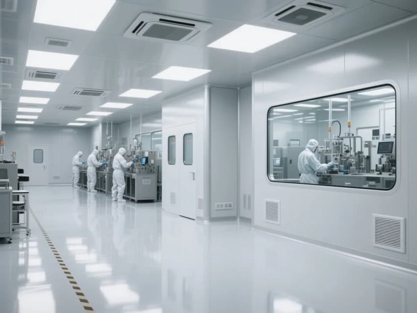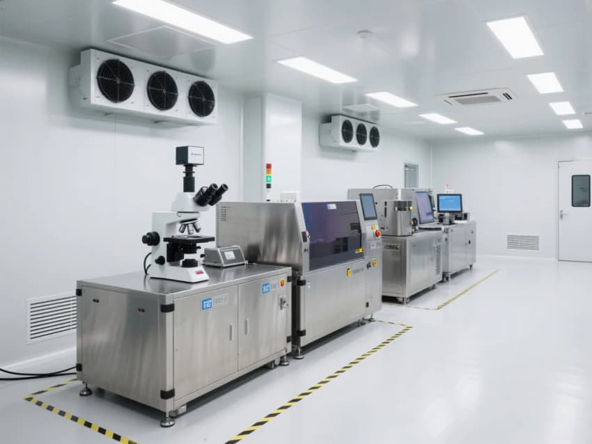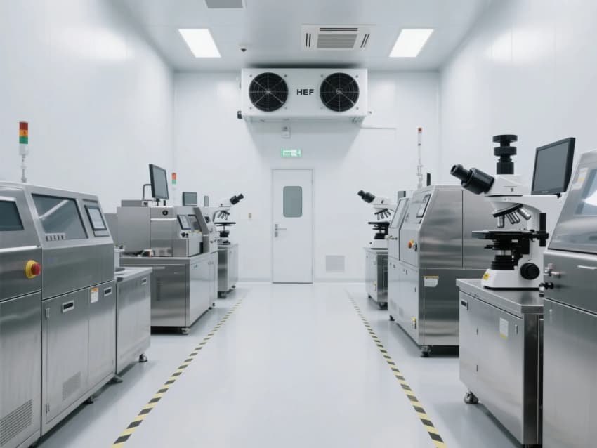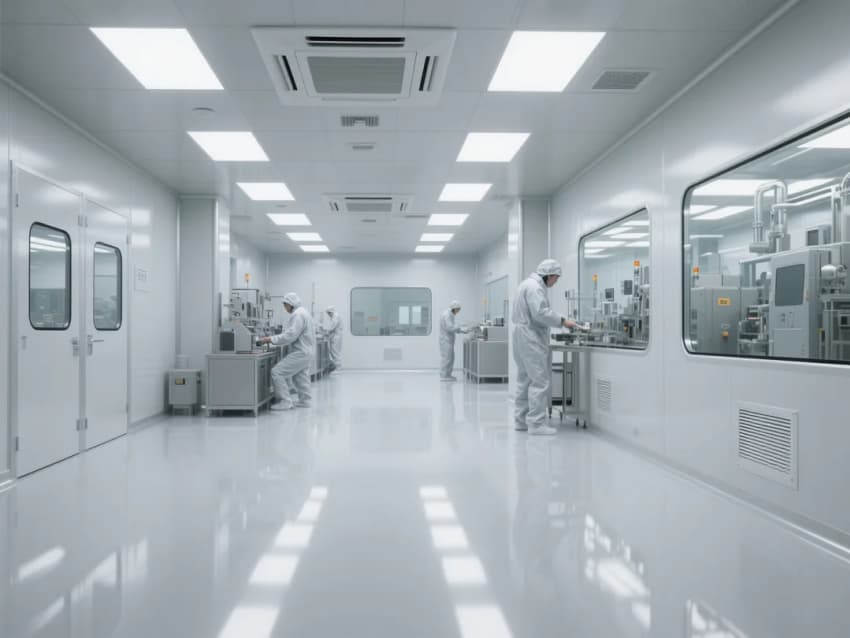 本方案采用"科技極簡主義"風格,以ISO 5級(萬級)潔凈標準為核心??臻g設計強調線性流動感,灰白主色調搭配防靜電環氧樹脂地坪,墻面采用抗菌彩鋼板。頂棚網格化FFU送風單元配合側墻回風,形成垂直層流。功能分區明確,包含更衣緩沖間(Class 7)、核心生產區(Class 5)、設備維護通道。智能控制系統集成溫濕度(22±1℃/45±5%)、壓差(+10Pa)、粒子監測顯示。創新采用LED黃光照明減少光致氧化,設備基座增設主動減震系統。設計融合人機工程學,防靜電設施覆蓋率100%,通過藍色光帶引導潔凈動線,實現功能性與未來感的完美平衡。