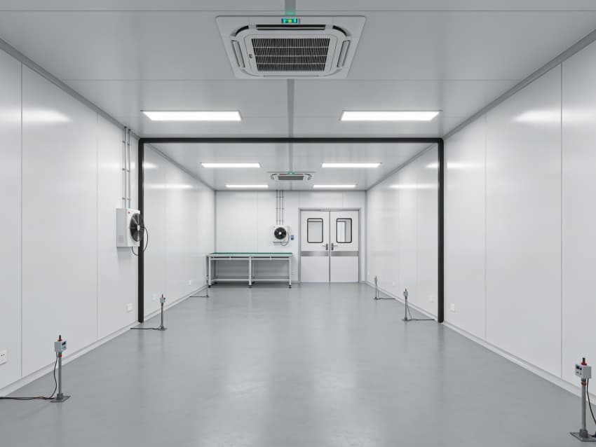 核心施工工藝,嚴控潔凈與防護性能。圍護結構選用0.8mm厚工業級抗菌彩鋼板,芯材采用防火保溫巖棉,拼接處用專用潔凈密封膠滿填,膠縫寬度3-5mm無氣泡、無開裂,墻角做≥50mm圓弧處理,避免微粒堆積與清潔死角。地面采用無縫防靜電環氧自流平,表面電阻控制在10?-10?Ω,平整度誤差≤2mm,耐磨損、易消殺,同時鋪設防靜電接地系統,杜絕靜電損壞精密顯示組件;墻面、吊頂光滑平整,無揚塵、無脫落,適配高頻消殺需求。