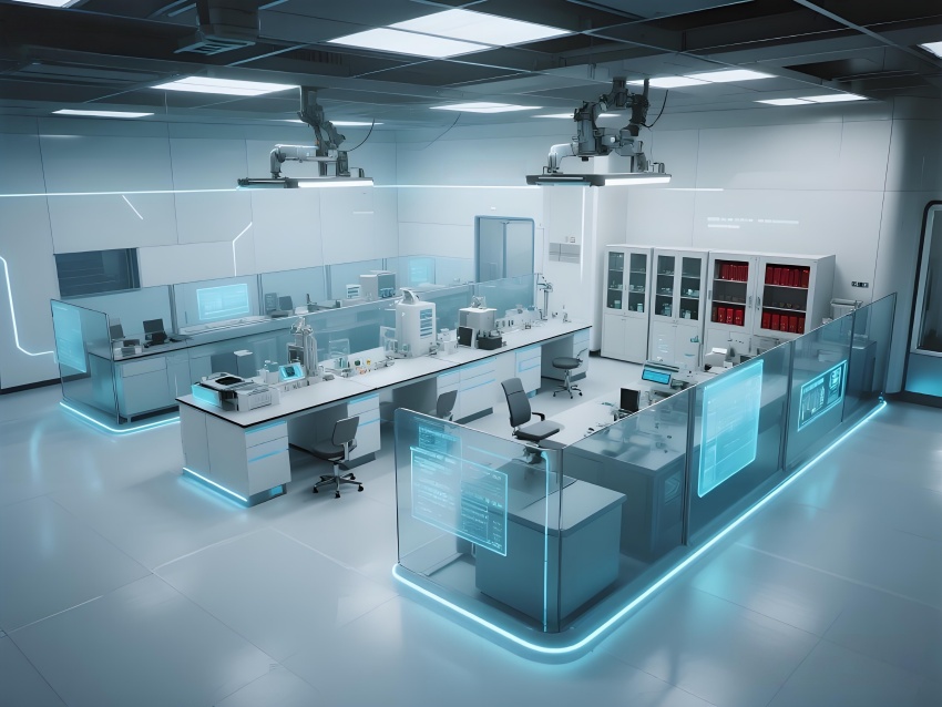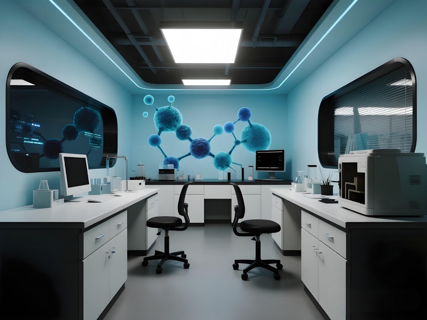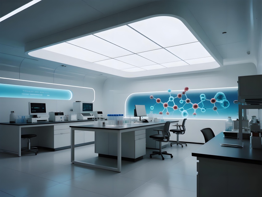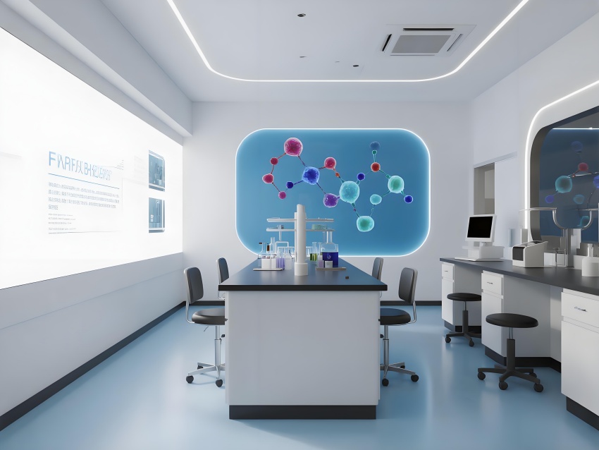 本設(shè)計(jì)以"科技賦能生命"為核心理念,構(gòu)建純凈高效的研發(fā)環(huán)境。主體采用冰川白與醫(yī)用藍(lán)的漸變配色,墻面嵌入動(dòng)態(tài)生物分子結(jié)構(gòu)LED裝飾,營(yíng)造科研儀式感。實(shí)驗(yàn)區(qū)采用模塊化懸浮工作臺(tái),透明智能玻璃隔斷實(shí)現(xiàn)空間通透性與功能分區(qū)的完美平衡。頂棚的流線(xiàn)型送風(fēng)系統(tǒng)與地面熒光導(dǎo)視帶形成立體動(dòng)線(xiàn)指引。核心無(wú)菌區(qū)采用圓形穹頂設(shè)計(jì),搭配全息投影滅菌提示界面。數(shù)據(jù)分析中心配備曲面智能白板墻,實(shí)時(shí)可視化研究數(shù)據(jù)。危化品存儲(chǔ)區(qū)通過(guò)紅色光暈警示與物理隔離確保安全。整體空間融合醫(yī)療級(jí)潔凈美學(xué)與科幻實(shí)驗(yàn)室語(yǔ)言,在嚴(yán)謹(jǐn)中注入未來(lái)感,通過(guò)智能交互界面與人性化燈光系統(tǒng),打造國(guó)際一流水準(zhǔn)的醫(yī)藥研發(fā)矩陣空間。