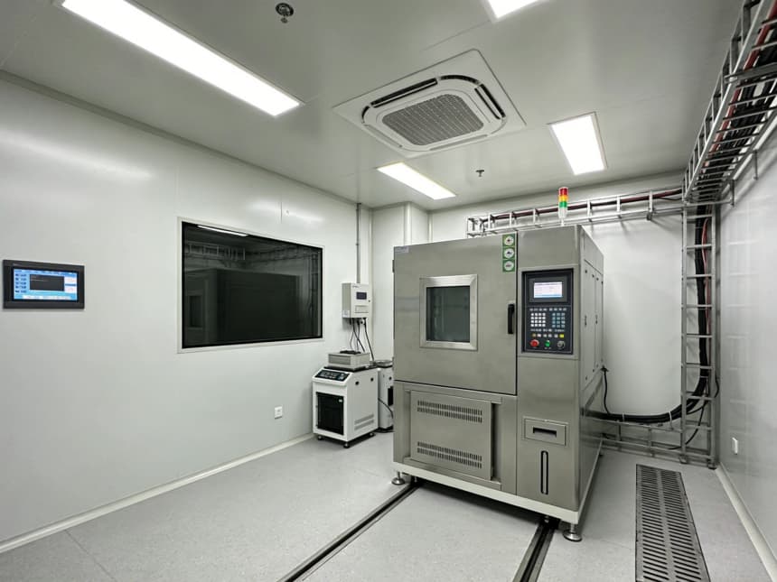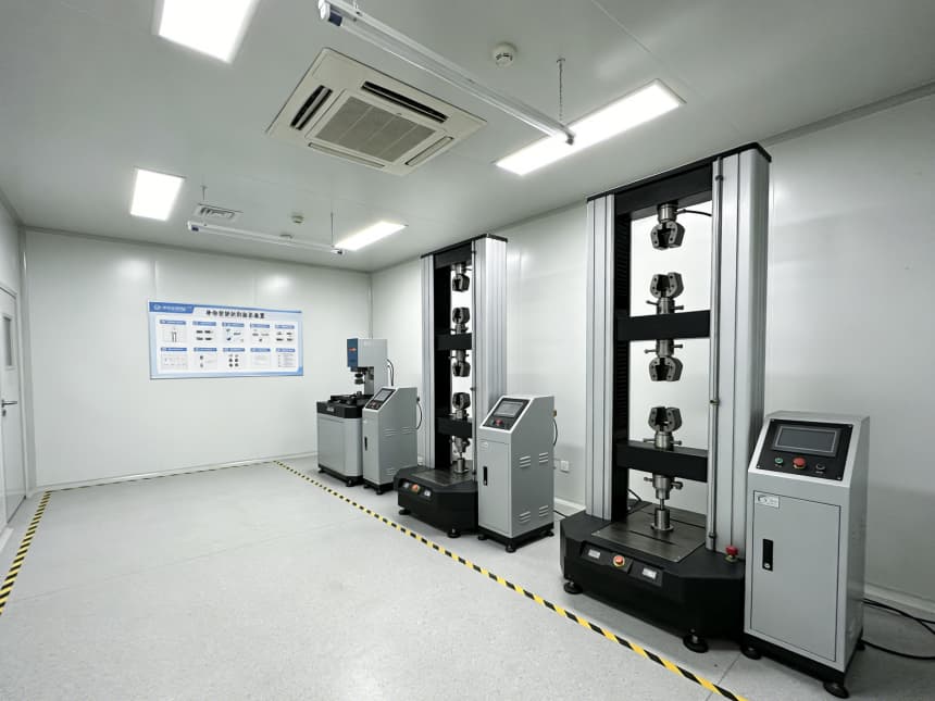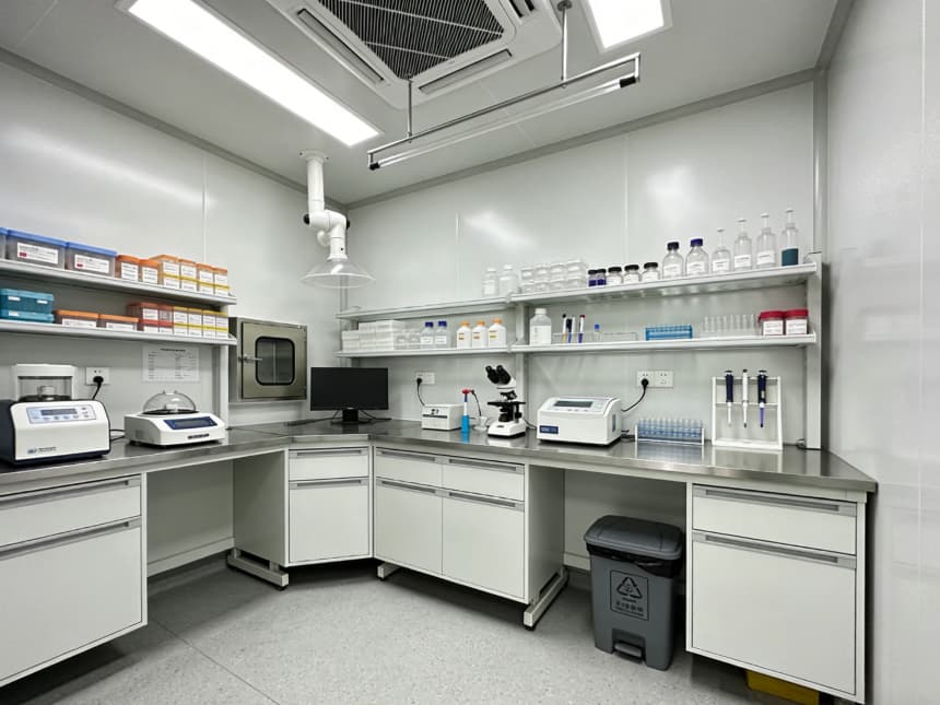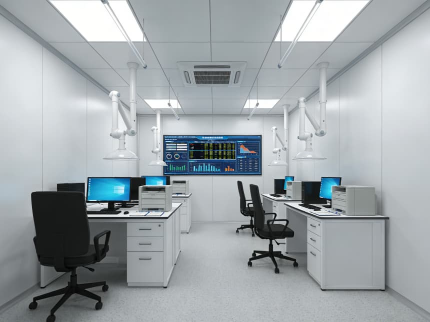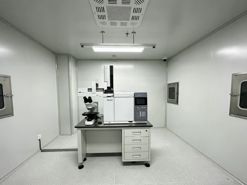 內部檢測空間均以淺灰色耐磨地坪搭配白色無縫潔凈墻面,視覺整潔且適配檢測核心需求。淺灰色地面選用高硬度環氧材質,抗壓耐磨、抗污易清潔,可耐受檢測過程中各類試劑殘留與設備搬運磨損;白色墻面采用環??咕繉?,平整度高、反光均勻,搭配嵌入式防眩光照明,為精密檢測提供清晰穩定的視覺環境,減少誤差干擾。