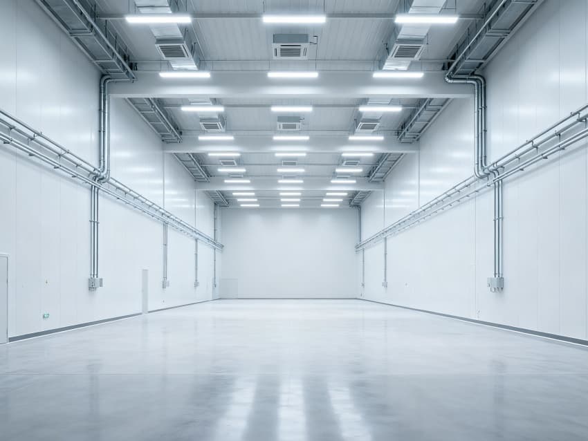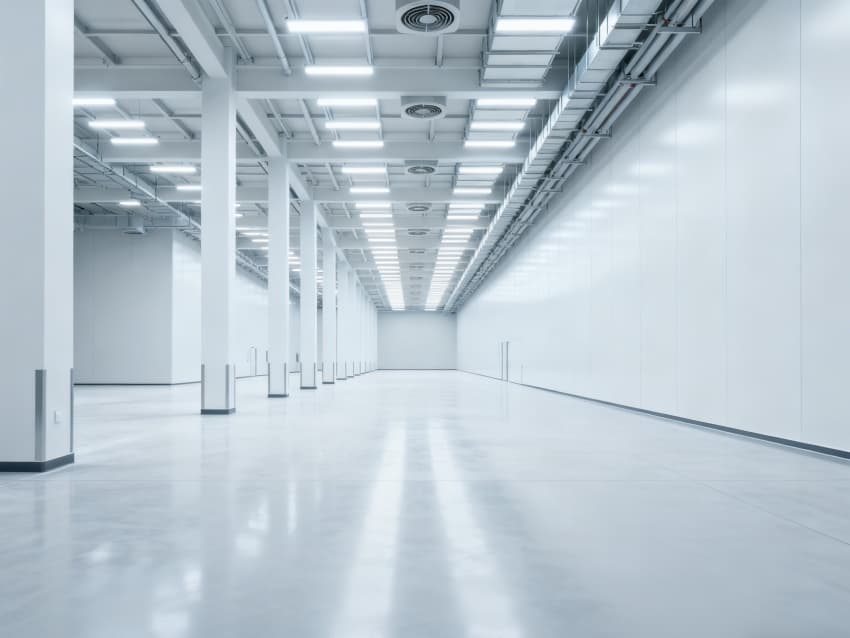 內(nèi)部6個生產(chǎn)車間均為無設備空曠布局,按工業(yè)級潔凈與承重標準建設:地面鋪設耐磨防靜電環(huán)氧地坪,墻面采用白色環(huán)保潔凈墻板,陰陽角做圓弧處理減少積塵;柱網(wǎng)間距達10米,預留設備安裝與物流通道空間;頂部整合恒溫恒濕新風系統(tǒng)與節(jié)能LED照明,管線暗藏于吊頂內(nèi),避免空間雜亂;車間之間通過通透玻璃隔斷銜接,進一步強化整體空曠感,為新能源產(chǎn)品規(guī)模化生產(chǎn)、柔性產(chǎn)線調(diào)整提供高效、潔凈的空間支撐。