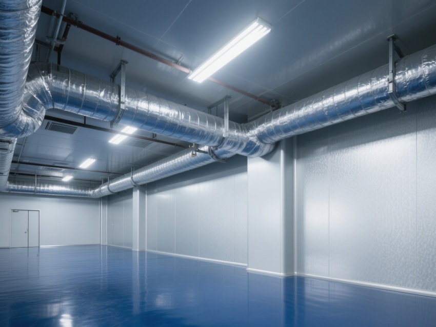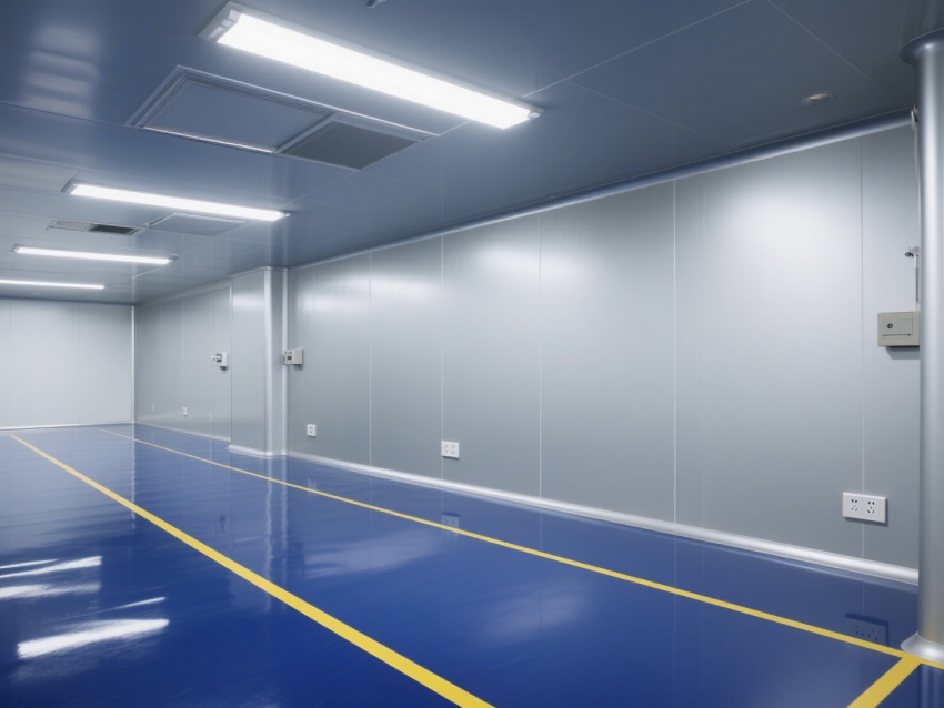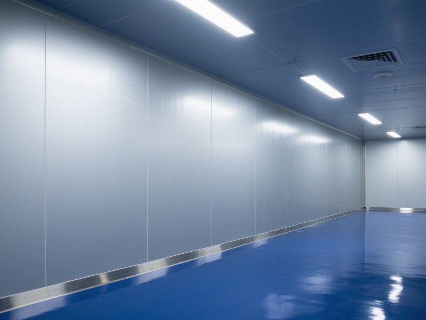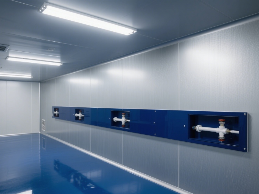 車間內部整體呈銀灰色和藍色,給人一種現(xiàn)代感和科技感。墻面、地面和天花板均采用無縫設計,便于清潔和消毒,防止灰塵和微粒的積聚。照明系統(tǒng)明亮且均勻,提供了良好的工作環(huán)境。