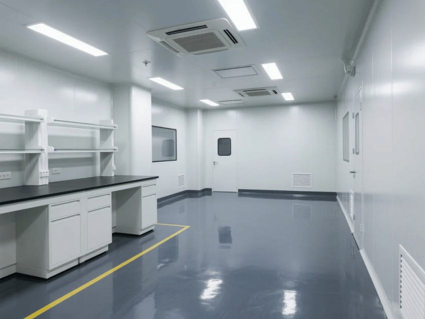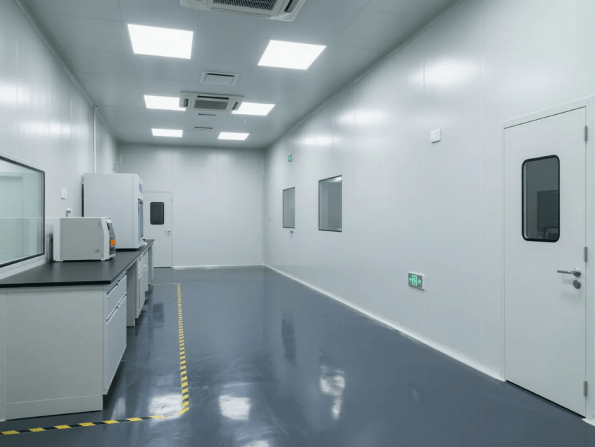 本工程嚴(yán)格遵循ISO14644-1Class7標(biāo)準(zhǔn),采用"科技工業(yè)風(fēng)"設(shè)計(jì)語言,打造高精度氣密檢測(cè)環(huán)境。實(shí)驗(yàn)室以白色彩鋼板墻體與深灰環(huán)氧防靜電地坪形成鮮明視覺對(duì)比,營造兼具科技感與功能性的檢測(cè)空間。