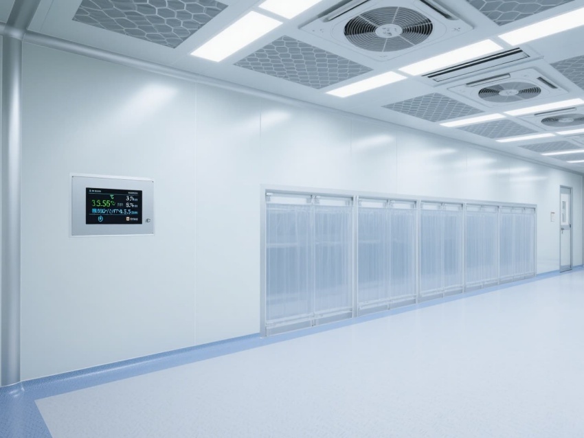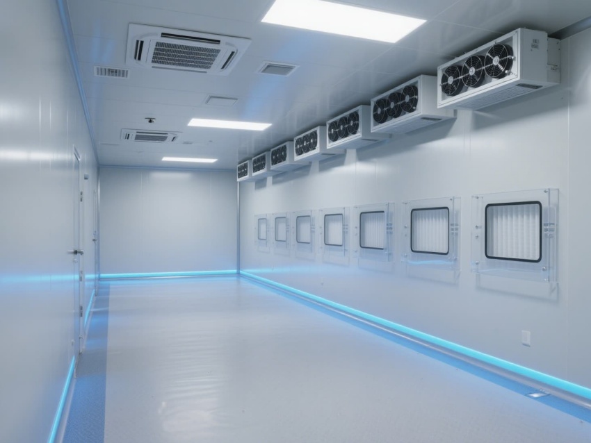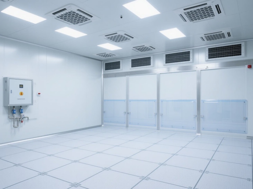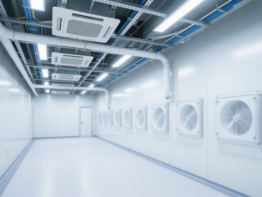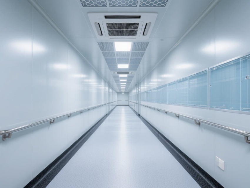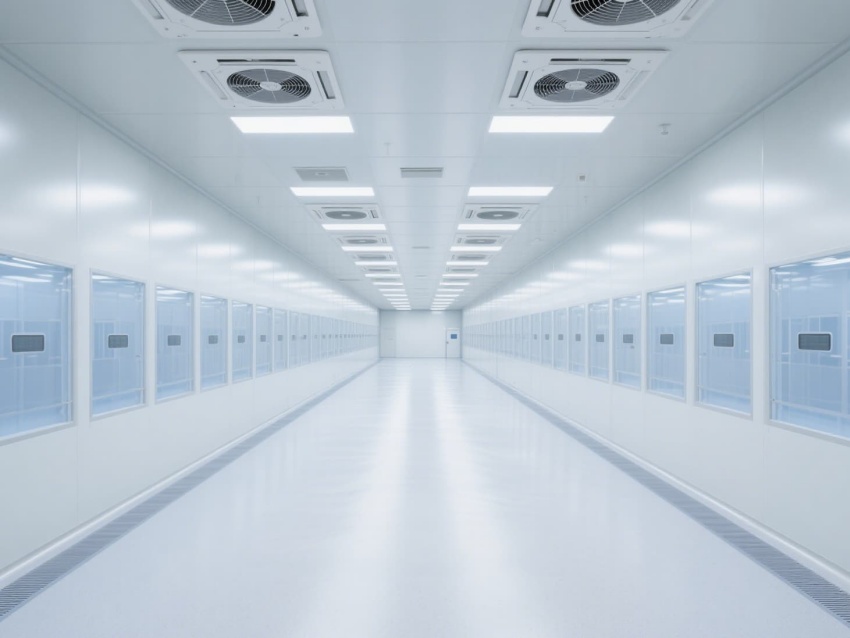 電子芯片廠無塵車間是芯片高精度生產(chǎn)的核心空間,其設(shè)計(jì)嚴(yán)格遵循百萬級潔凈標(biāo)準(zhǔn)。車間以銀白色抗菌彩鋼板搭建墻體與吊頂,搭配淺灰色防靜電環(huán)氧地坪,形成簡潔統(tǒng)一的視覺基調(diào)。頂部密布的高效過濾器與FFU風(fēng)機(jī)組,通過層流方式持續(xù)凈化空氣,確保每立方米空氣中0.5微米以上的塵埃顆粒不超過3520個(gè)。?