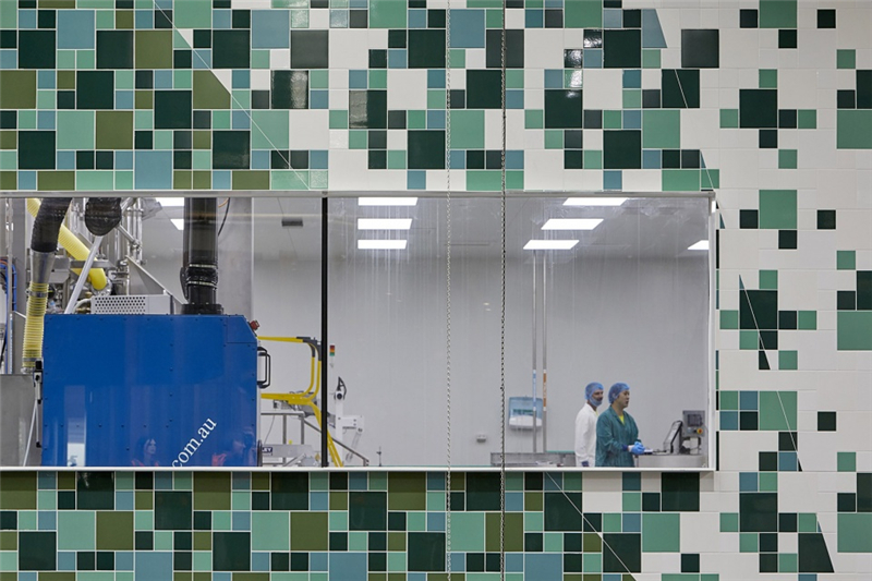 多彩的線條從附近的自然保護區一直延伸到位于生產區核心地帶的巨型壁畫上,吸引著員工和參觀工廠的訪客。產自本地的澳洲硬木和紋理豐富的墻面從外部景觀“流進”室內,在自然光線的配合下營造出富有生機的氛圍。