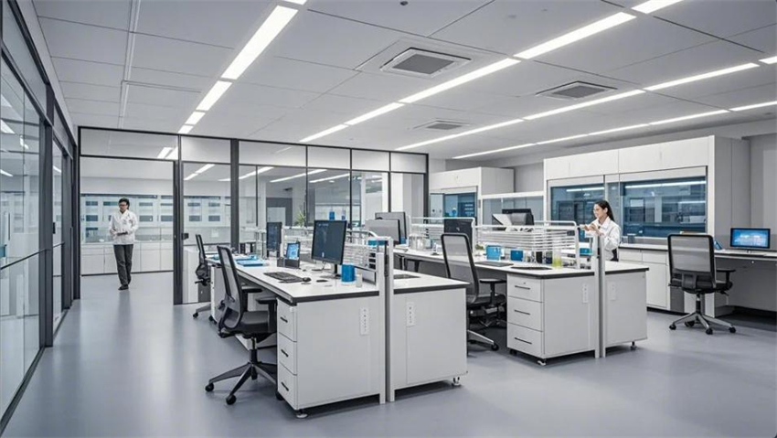1000平方米生物實驗室整體裝修,現代科技風格,實驗室分為核心實驗區、設備區、樣品存儲區和辦公區。核心實驗區占50%,設備區占30%,樣品存儲區占10%,辦公區占10%。核心實驗區:防靜電環氧地坪(淺灰色),白色彩鋼板墻面和天花板,頂部高效過濾器(HEPA),不銹鋼實驗臺,設備排列整齊。設備區:精密儀器整齊排列,地面為防靜電PVC地板(淺色)。樣品存儲區:冷藏柜和樣品架整齊,溫濕度控制。辦公區:玻璃隔斷,現代簡約辦公桌。整體色彩:白色、淺灰色、科技藍點綴。