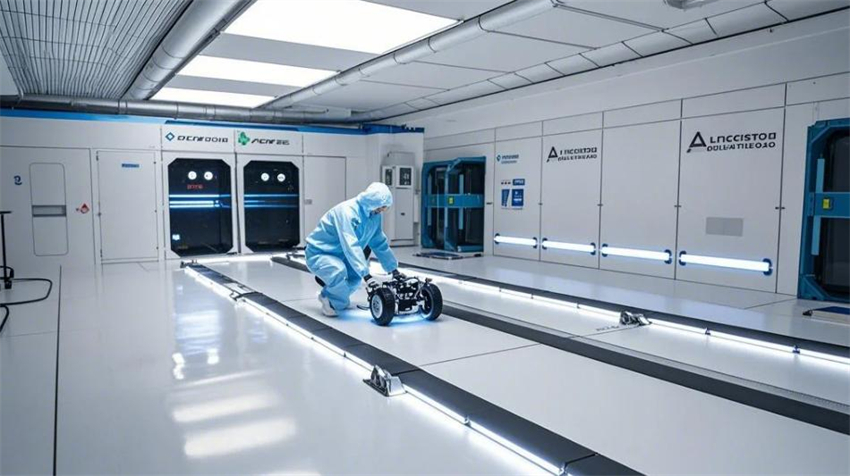 機械人研發(fā)實驗室,未來科技風格。實驗室分為研發(fā)區(qū)、測試區(qū)、裝配區(qū)和辦公區(qū)。研發(fā)區(qū)占50%,測試區(qū)占30%,裝配區(qū)占10%,辦公區(qū)占10%。研發(fā)區(qū):防靜電環(huán)氧地坪(淺灰色),白色彩鋼板墻面和天花板,頂部高效過濾器(HEPA),不銹鋼工作臺,機械人原型和3D打印機排列整齊。測試區(qū):機械人測試平臺,地面為防靜電PVC地板(淺色)。裝配區(qū):工具架整齊,機械人部件分類存放。辦公區(qū):玻璃隔斷,現(xiàn)代簡約辦公桌。整體色彩:白色、淺灰色、科技藍點綴。