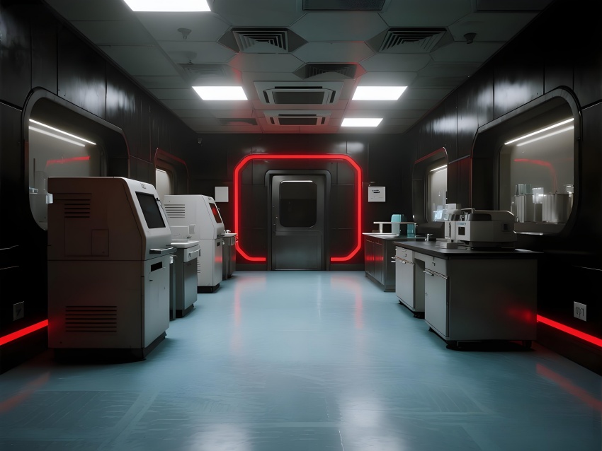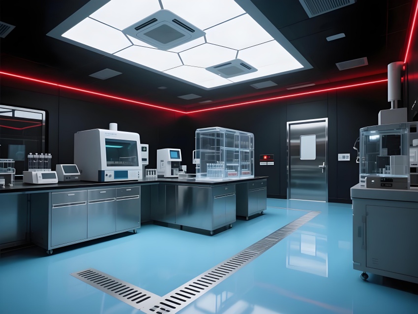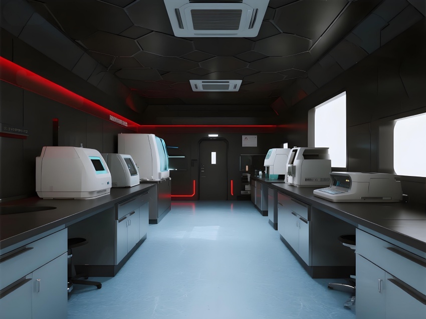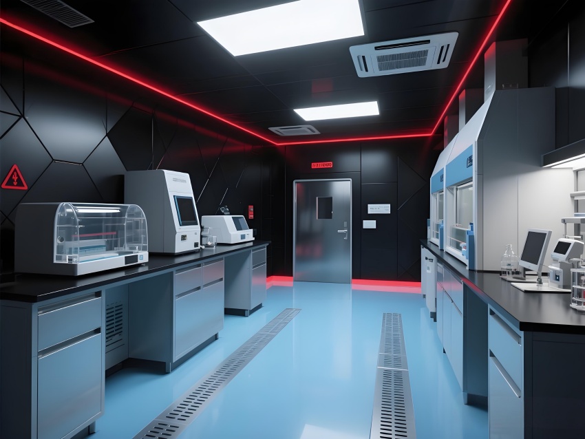 本實驗室采用"生物防御未來主義"風格,通過銳利的幾何切割與警示色彩構建科研防護美學。核心實驗區(qū)以啞光黑墻面搭配紅色應急光帶,形成視覺危險預警,與清潔區(qū)的冰藍色環(huán)氧樹脂地面構成強烈功能區(qū)分。設備區(qū)的金屬原色與透明PCR儀散熱孔展現(xiàn)工業(yè)精密感,天花板的六邊形送風單元與地面導流孔形成垂直氣流可視化。防爆玻璃觀察窗嵌入電子壓差顯示屏,氣閘室的黃色斜紋標識強化生物安全等級過渡。通過冷白光與設備界面藍光的層疊照明,在滿足BSL-2物理防護要求的同時,營造出科幻電影般的嚴謹科技氛圍,傳遞基因工程特有的精密與危險并存的特質。